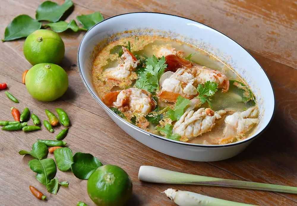 Tomyum Kung is a traditional Thai shrimp soup. The shrimp is cooked with herbs, including lemongrass, kaffir lime leaves, citronella, and scallions, and then seasoned with local condiments. It has a unique aroma and vivid color, combining multiple flavors, including sweet, sour, salty, spicy, creamy, and slightly bitter.